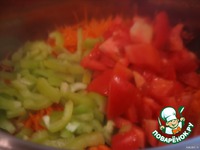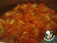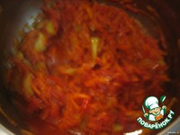 Tем временем "шубка лисья", т. е. морковь - уже прилично потушилась с др. овощами и мы добавляем туда томат. пасту - у меня "помидорка" |