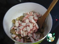 Шампиньоны и крабовые палочки режем пластиками, сыр на терку |