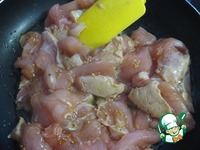 Нагреваем на сковороде масло до появления легкого приятного запаха, выкладываем курицу и, постоянно помешивая, обжарим ее со всех сторон до готовности |