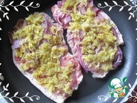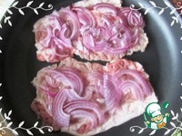 Мясо укладываем на сковороду или в форму. На мясо выкладываем лук. |
