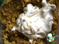 Смешать манку с яичной массой. Добавить просеянный крахмал и перемешать. Тесто должно быть как густое, как на оладьи. Если что – добавить чуть крахмала. |