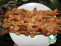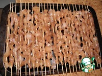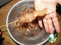 Моем филе и даем подсохнуть. Шпажки (длинна моих 30см) в это время замочить в воде полностью. Если шашлычки будете мариновать ночь, то шпажки тоже стоят ночь в воде. |