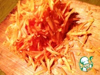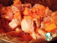 В сотейнике разогреть растительное масло, положить лук, морковь, обжаривать до прозрачности лука. Добавить филе. Обжаривать до изменения цвета мяса. Положить подготовленную тыкву и перемешать. |