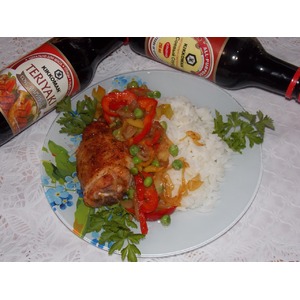 Влить 1 ст. л. соевого соуса, добавить щепотку аджики сухой, посолить и поперчить. Прогреть 1-2 минуты. Подать курицу с рисом и овощами. |