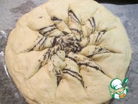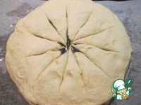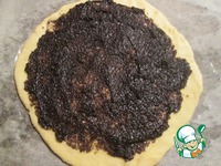 Тесто разделите на три части. Раскатайте одну частьтеста в круг диаметром 25-30 см., сразу перенесите его на застеленный бумагой противень и смажьте половиной начинки. |