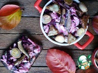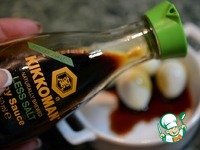 Свеклу, и яйца отварить. Перепелиные яйца очистить и залить 1 ст. л. соевого соуса. Вы можете опустить этот шаг или можете заменить перепелиные яйца куриными. Я привожу оригинальный рецепт. |