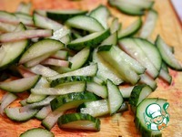 Свеклу и огурец нарезать тонкими полосочками, шалот полукольцами, яйца мелко порубить. |
