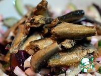 Смешиваем полученные ингредиенты. Добавляем шпроты (если крупные - разрезать пополам, у меня мелкие - я просто отрезала хвостик). Поливаем оставшейся заправкой. |