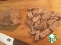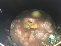 Мясо промыли, налили в кастрюлю воды, закинули туда мясо, лавровый лист, 3 зубчика чеснока, душистый перчик, соль и одну головку лука. |