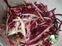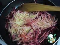 Оставшиеся части от луковицы режем соломкой, картофель и свеклу на терке длиной соломкой |