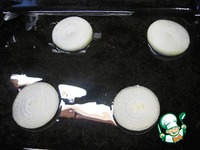 Противень смазываем маслом, выкладываем лук (извините за качество фото, время вечернее, а свет у нас не ахти) |