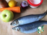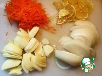Лук нарезаем полукольцами, лимон и очищенное яблоко - тонкими дольками, морковь натираем на терке. |
