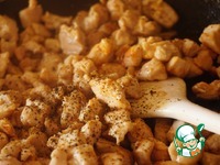 Разогреваем сковороду, наливаем растительное масло. Отправляем туда курочку. И жарим на огне чуть сильнее среднего. |