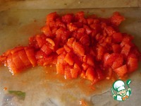 А помидоры, точнее их шкурка, уже дошла до «кондиции». Снимаем ее с помидоров и нарезаем их кубиками. |