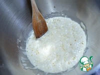В теплом молоке раскрошить прессованные дрожжи, добавить 45 г. муки и 1 ч. л. меда. Замесить опару. Накрыть и оставить на 1,5 часа в теплом месте. |