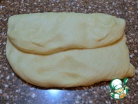Рабочую поверхность смазать 1 ч. л. растительного масла. Выложить тесто. Растянуть его в пласт и сверху сложить. |