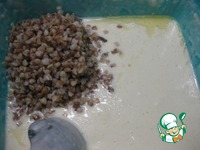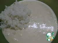 Затем делим нашу опару на две части, в одну добавляем отварной рис |