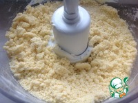 Муку просеять вместе с разрыхлителем, добавить холодное масло и порубить в блендере до состояния крошки. |