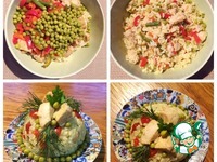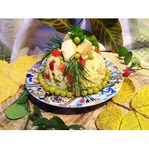 Также добавляем несколько ложек зеленого консервированного горошка и все аккуратно перемешиваем. Салат готов. Сервируем по желанию, и можно угощать домочадцев или гостей. Приятного аппетита! |