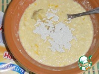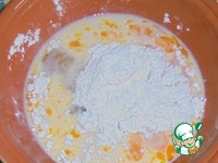 Насыпаем половину муки, перемешиваем. |
