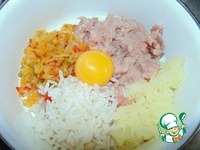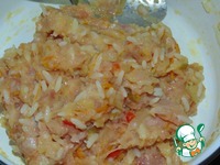 Маленький кусочек кабачка натереть на мелкой терке и отправить к фаршу. Добавить отварной рис, овощи и желток. Чуть-чуть посолить. |