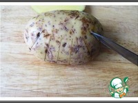 Картошину хорошо промываем, шкурку не чистим. Срезаем часть картошины, как крышечку. |