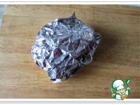 Накрываем срезанной частью, как крышечкой, заворачиваем в фольгу и ставим в разогретую до 200 град. духовку ровно на 1 час. |