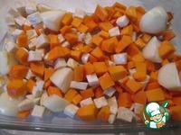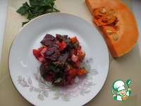 Духовку разогрейте до 200 градусов. Свеклу тщательно вымойте, заверните в фольгу и положите в духовку на один час. Тыкву и сельдерей порежьте кубиками, лук - четвертинками. Выложите овощи в форму для запекания, посолите, поперчите, полейте маслом. Запекайте до мягкости, примерно 30 минут.