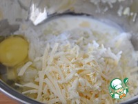 Добавляем сливки (100 мл), яйца и натёртый на крупной тёрке твёрдый сыр. Не солим, соли достаточно от сыра и солёной рыбы. Всё перемешиваем. |