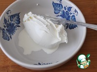 Пока готовится рулет, готовим начинку. Берём творожный сыр, смешиваем с оставшимися сливками и перемешиваем вилкой до однородной кремообразной структуры. |