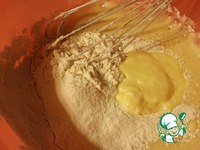 Затем добавить растопленное сливочное масло и частями просеянную муку. |