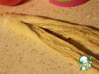 Полученный рулет разрезать вдоль на две части. Повернуть половинки разрезами вверх. |