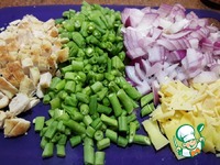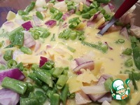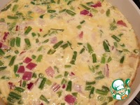 В посудину с яично-молочной смесью выкладываем все нарезанные ингредиенты. Хорошо перемешиваем. |