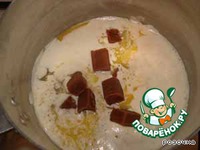 Варим (при тихом кипении) до тех пор, пока ириски не растают. Затем выключаем газ и остужаем массу. |