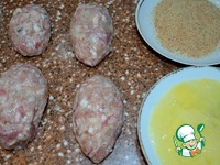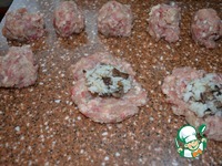 Вызревший фарш разделить на 13 частей, по 85 г. Рабочую поверхность смочить водой, расплющить кусочек фарша и выложить на середину по 1 десертной ложке начинки. Закрыв все фаршем, сформовать котлету. |