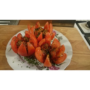 Приступим! Помидор кладем на разделочную доску попкой вниз и острым ножом делаем надрезы практически до конца, деля плод на восемь частей (как на видео). Аккуратно раскрываем, получается цветок из помидора. Выкладываем томаты на противень, по вкусу посыпаем сушеными базиликом, орегано и солью. Сбрызгиваем оливковым маслом и убираем в духовку (180 гр) на 20 минут. Посыпаем мелко рубленной свежей зеленью. Готово!!! Приятного!!!
