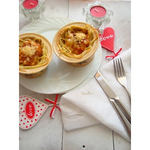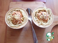 В общем блюдо готово. Но для красивой подачи я взяла 2 керамические формочки, смазала их маслом, выложила спагетти, сделав углубление. |