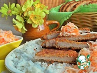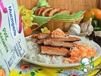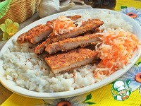 Описание: В нашем доме часто отбивные... Хоть в будни, хоть в праздник всегда удачное блюдо на столе! Можно каждый раз добавлять новые специи и подавать с разным гарниром. Сегодня у мяса богатая "шубка", а подавать будем с рассыпчатым рисом, который благодаря пакетикам варится очень быстро.