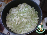 Капусту нашинковать. Добавить к луку на сковороду, тушить. Вконце добавить соль, перец. |