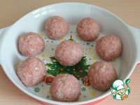 Картофель нашинковать тонкими слайсами. Выложить в форму для запекания вместе с мясными шариками-тефтельками. |
