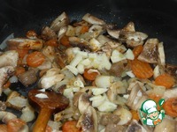 Грибы очистить от пленки, нарезать произвольно не большими кусочками. Добавить к луку с морковью, продолжая обжаривать. |