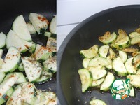 Цуккини обжарить в хорошо разогретом растительном масле, добавив специи, соль, перец, до румяной корочки. |