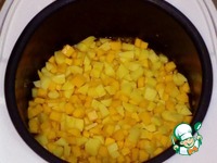Картошку помыть, почистить и нарезать мелкими кубиками. В тыквенное пюре добавить нарезанные картошку и тыкву. Влить около 1л воды. Перемешать. |