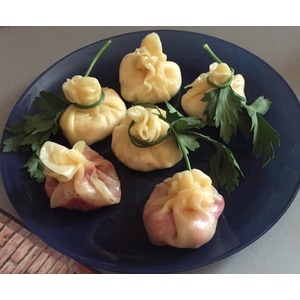 Далее кладём чайную ложку начинки в середину и собираем мешочек, делать нужно быстро, пока сыр не остыл |