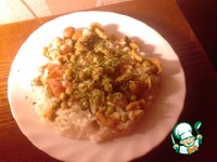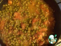 Лук почистите, нарежьте, положите в смазанную сковороду сливочным маслом и пожарьте. Помидоры помойте, нарежьте и добавьте к луку за 10 мин. до готовности, горошек-за 5 мин. Жарьте всё это 15 мин. |