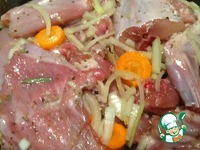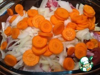 Лук почистить, порезать четверть кольцами. Морковь почистить, помыть, порезать кружочками. Все положить к кролику. |