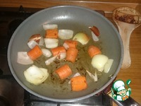 Берем 1 луковицу, 1 морковь. Режем на куски и обжариваем на сухой сковороде. Сковородку не моем. |