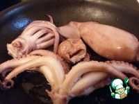 Осьминога и кальмара промыть и обжарить буквально 1 минутку на сковородке полив их 1 ч. л. яблочного уксуса. Эта процедура обеспечит им мягкость. |