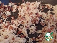 В это время бульон в рисе практически выпарился. Добавляем зеленый горошек и морепродукты. Оставляем прогреться на пару минут. |