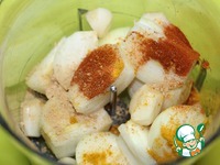 Лук, чеснок, имбирь, лимонный сок, молотый жгучий красный перец и куркуму пробить в блендере |